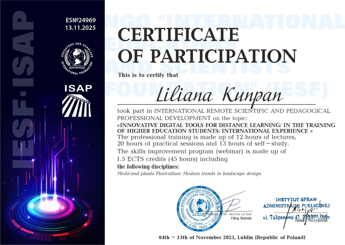 З 4 по 14 листопада 2025 року старший викладач кафедри садово-паркового господарства Уманського національного університету Ліліана КУНПАН пройшла Міжнародне підвищення кваліфікації на тему: «Інноваційні цифрові інструменти для дистанційного навчання: при підготовці здобувачів вищої освіти: міжнародний досвід», яке було організоване Науково-дослідним інститутом Люблінського науково-технологічного парку (Польща) та IESF «Міжнародною фундацією науковців та освітян».