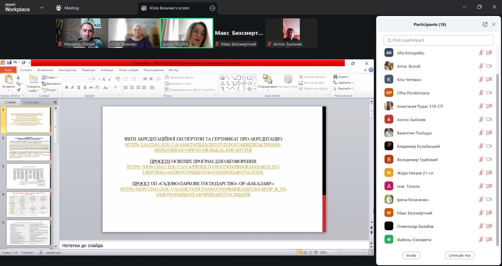 На зустрічі були присутні: в.о. декана факультету лісового і садово-паркового господарства Ірини КОЗАЧЕНКО, завідувач кафедри садово-паркового господарства Юлія ВЕЛИЧКО, доцент кафедри садово-паркового господарства Ірина ПУШКА, доцент кафедри садово-паркового господарства Михайло ОСІПОВ, професор кафедри садово-паркового господарства Валентин ПОЛІЩУК, старший викладач кафедри садово-паркового господарства Анна БРОВДІ, старший викладач кафедри садово-паркового господарства Ліліана КУНПАН, стейкхолдери: директор Національного дендрологічного парку «Софіївка» НАН України, кандидат біологічних наук Володимир ГРАБОВИЙ, заступник директора з питань соціального розвитку та інновацій, кандидат с-г. наук Володимир КУЛЬБІЦЬКИЙ, старший науковий співробітник відділу дендрології та паркобудівництва, кандидат біологічних наук Ольга ПОРОХНЯВА, науковий співробітник відділу декоративних і плодових рослин, кандидат біологічних наук Алла КОНОПЕЛЬКО, здобувачі вищої освіти: аспірант кафедри садово-паркового господарства Антон ЗАЛІЗНЯК, аспірант кафедри садово-паркового господарства Олександр БАЛАБАК; студентка 11-сп групи Кіра ЧЕПІЖКО, студентка 21-сп групи Наталія ЖОРА, студентка 21-сп групи Єлизавета ФАБЕЛЬ, студент 11к-сп групи Ілля ТОПОЛЬ, студентка 31к-сп групи Анастасія РУДАС, студент 11м-сп групи Максим БЕЗСМЕРТНИЙ.