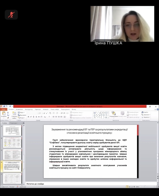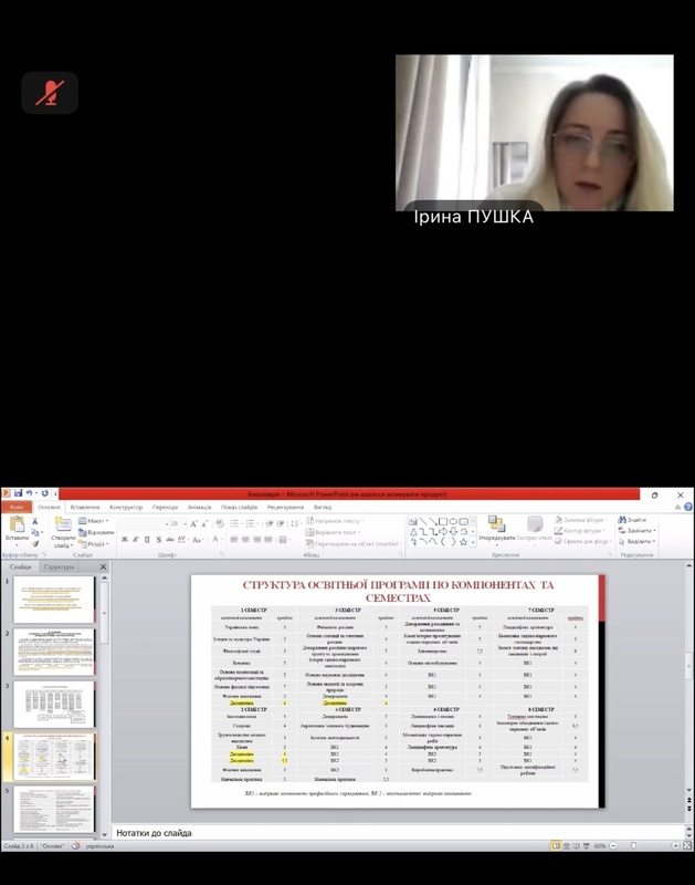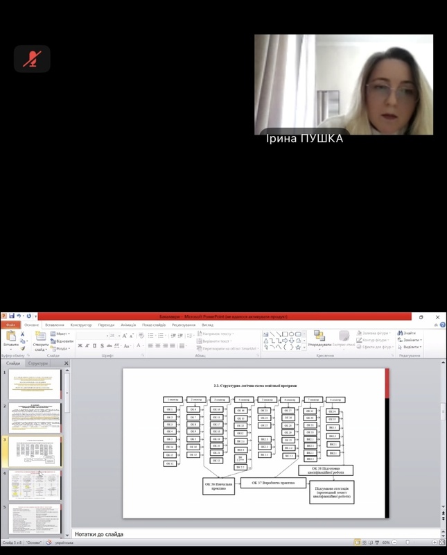 Гарант ОП Ірина ПУШКА зазначила, що в минулому 2025 році бакалаврська освітня програма проходила акредитацію, яка пройшла успішно. Вісім критеріїв звіту оцінено на «В», тобто ті, що в повній мірі відповідають стандарту та вимогам вищої освіти, та один критерій, а саме «Прозорість та публічність», визначено як зразковий.